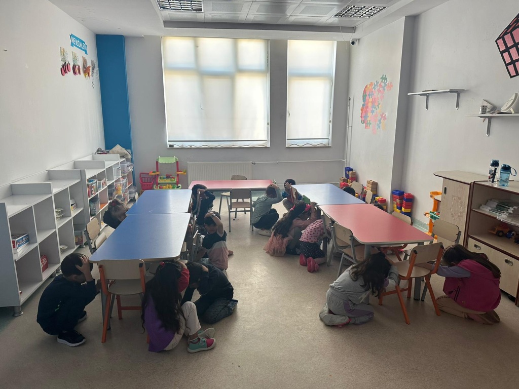 Deprem uyarısının yapılmasıyla birlikte çocuklarımız sınıflarında ''Çök, Kapan, Tutun'' pozisyonuna geçtiler.